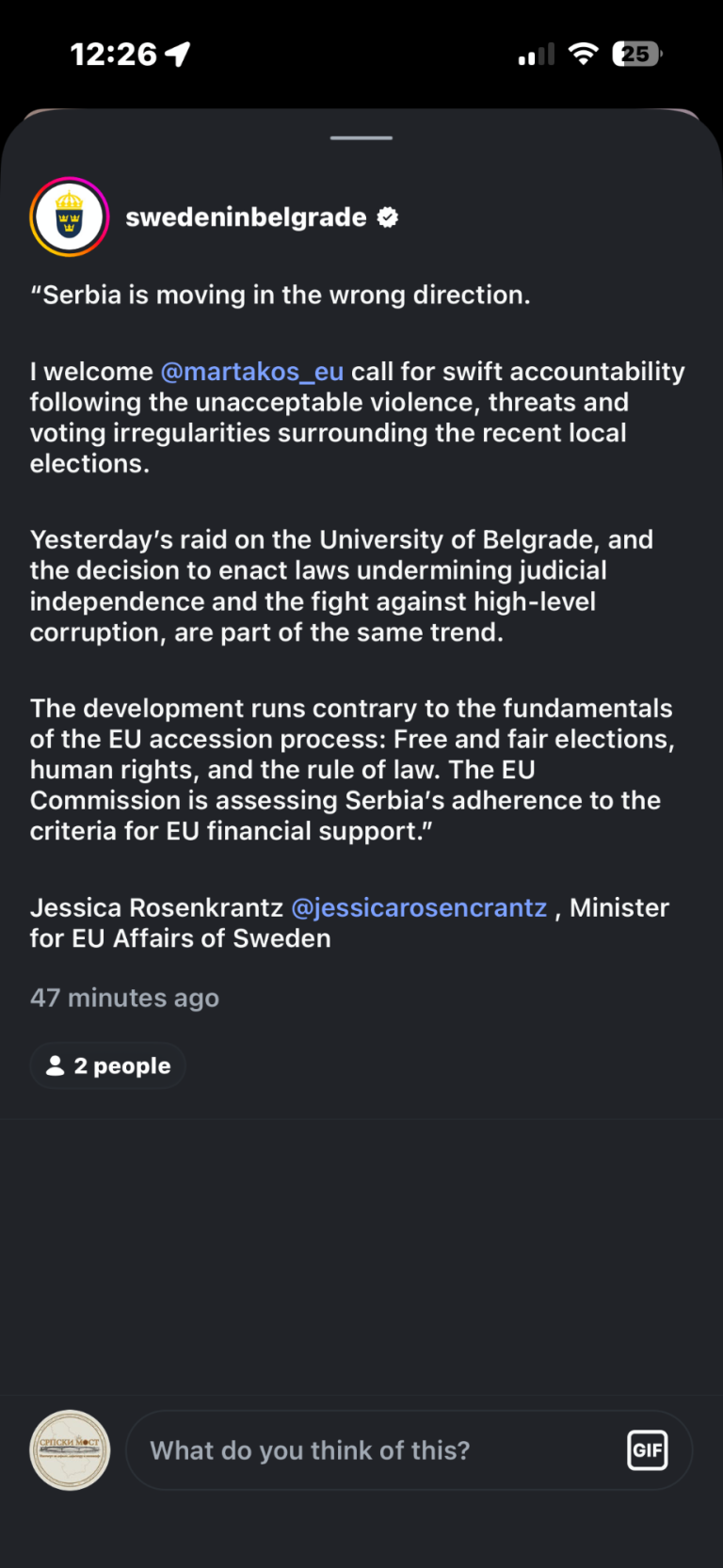 Паралелно, упутили смо дипломатски прецизан допис Амбасади Краљевине Шведске у Београду, са захтевом да се у јавним објавама користи језик који одражава процесну стварност, без политички оптерећених формулација. Наш циљ је једноставан: да институционална истина остане проверљива, да се смањи поларизација и да се ојача јавни простор у коме доминирају чињенице, надлежности и процедуре.