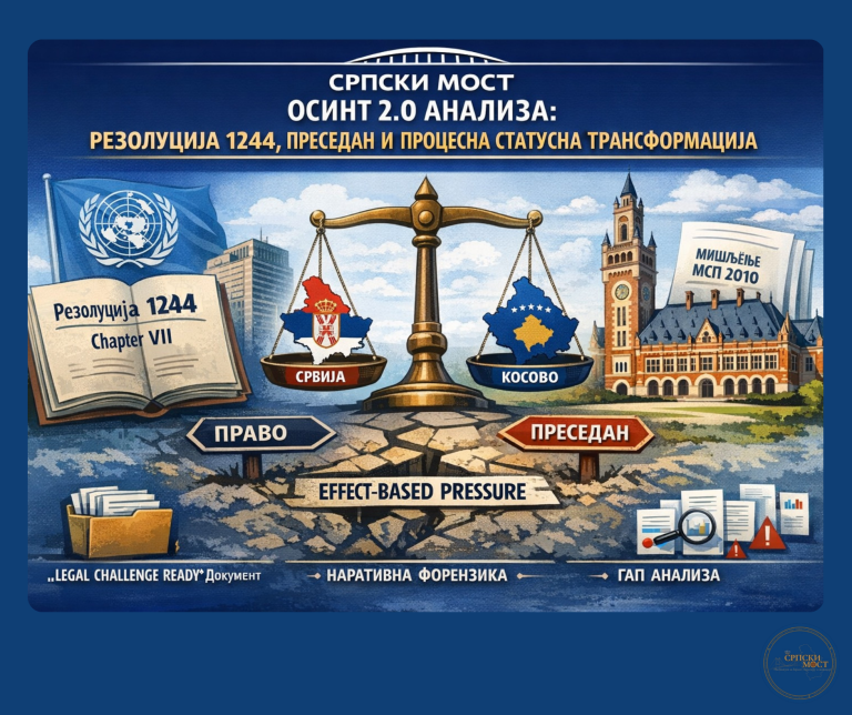 Српски Мост објављује ОСИНТ 2.0 анализу (Axis C) која разматра системски ризик настанка преседанског обрасца у међународном праву: да ли политички процеси, механизми условљавања и формуле „нормализације“ могу у пракси производити статусно релевантне ефекте без формалне одлуке Савета безбедности Уједињених нација.