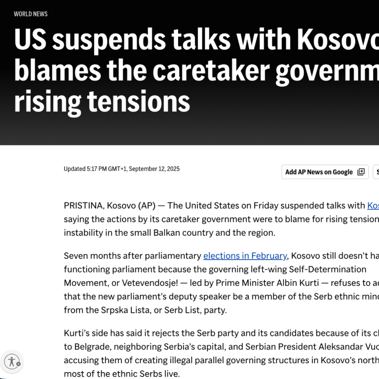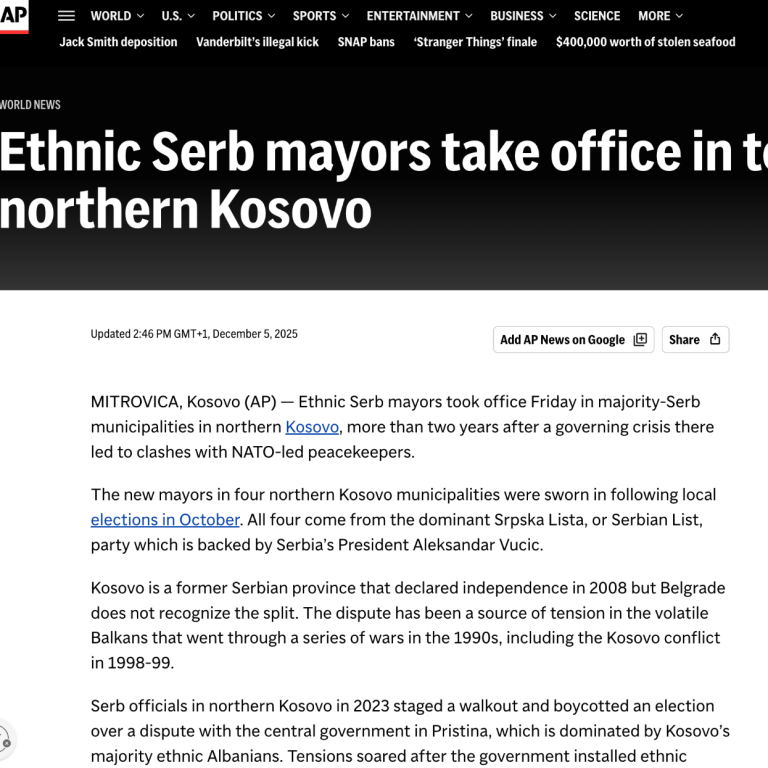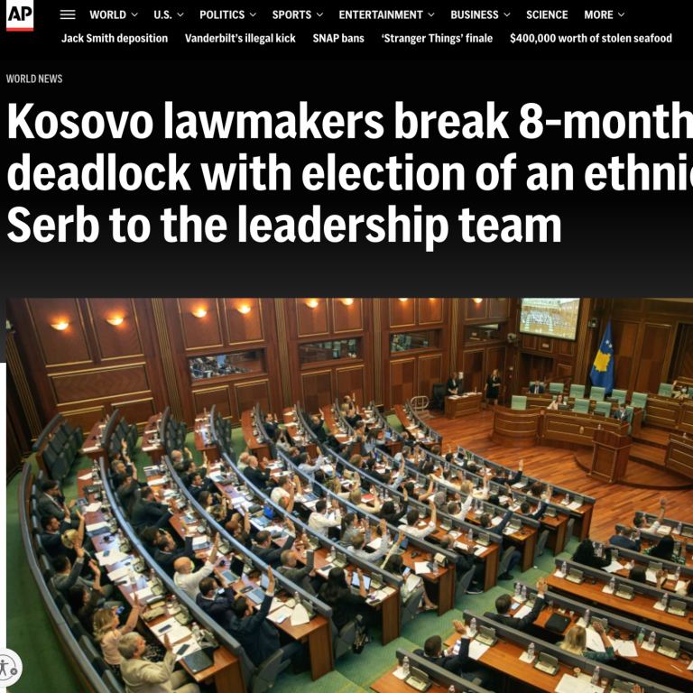 Поводом извештаја агенције Associated Press од 10 октобра 2025 године корисно је указати на један шири и понављајући образац у међународном медијском наративу који се односи на репрезентацију Срба у институцијама на Косову.