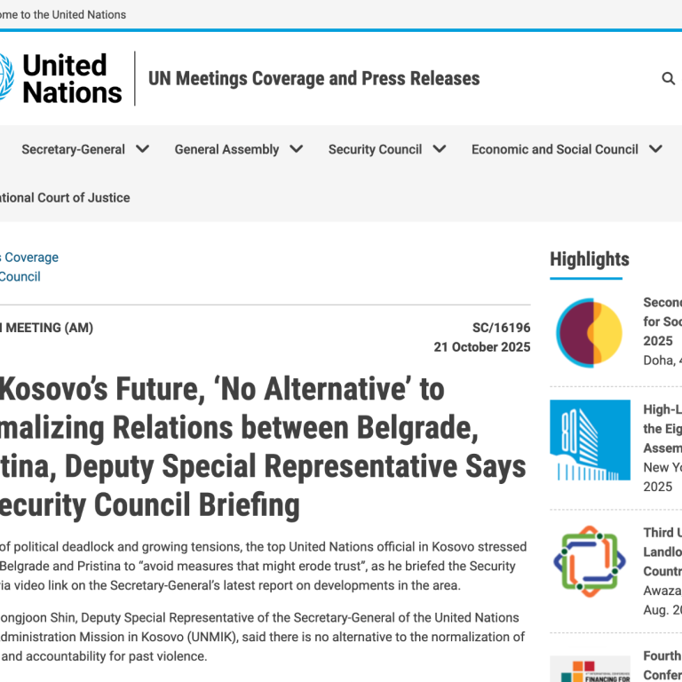 Поводом саопштења прес службе United Nations Press од 21 октобра 2025 године у којем се поново позива на нормализацију односа коришћењем општег политичког језика корисно је указати на структурни образац који се понавља у кратким форматима УН комуникације.