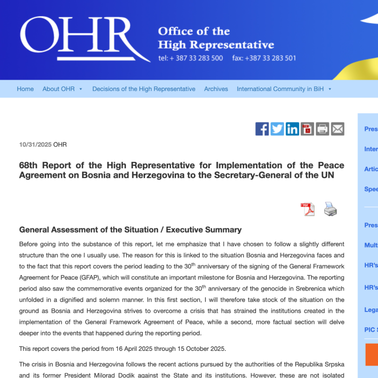 Поводом званичног извештаја који је објавио Office of the High Representative 31 октобра 2025 године уочљив је образац који је карактеристичан за део извештајне праксе ОХР а који има значајне политичке и правне импликације унутар дејтонског уставног оквира Босне и Херцеговине.